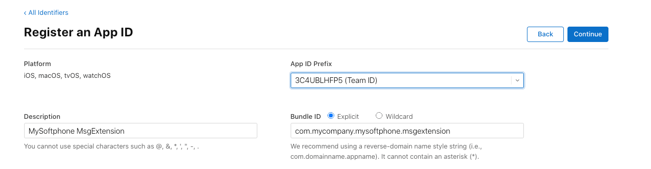 Next you need to create an application Identifier for the main application and also the associated messaging extension. The messaging extension allows text messages to be received via Push notifications. The value for application Identifier must be the same as the entry in the portal.